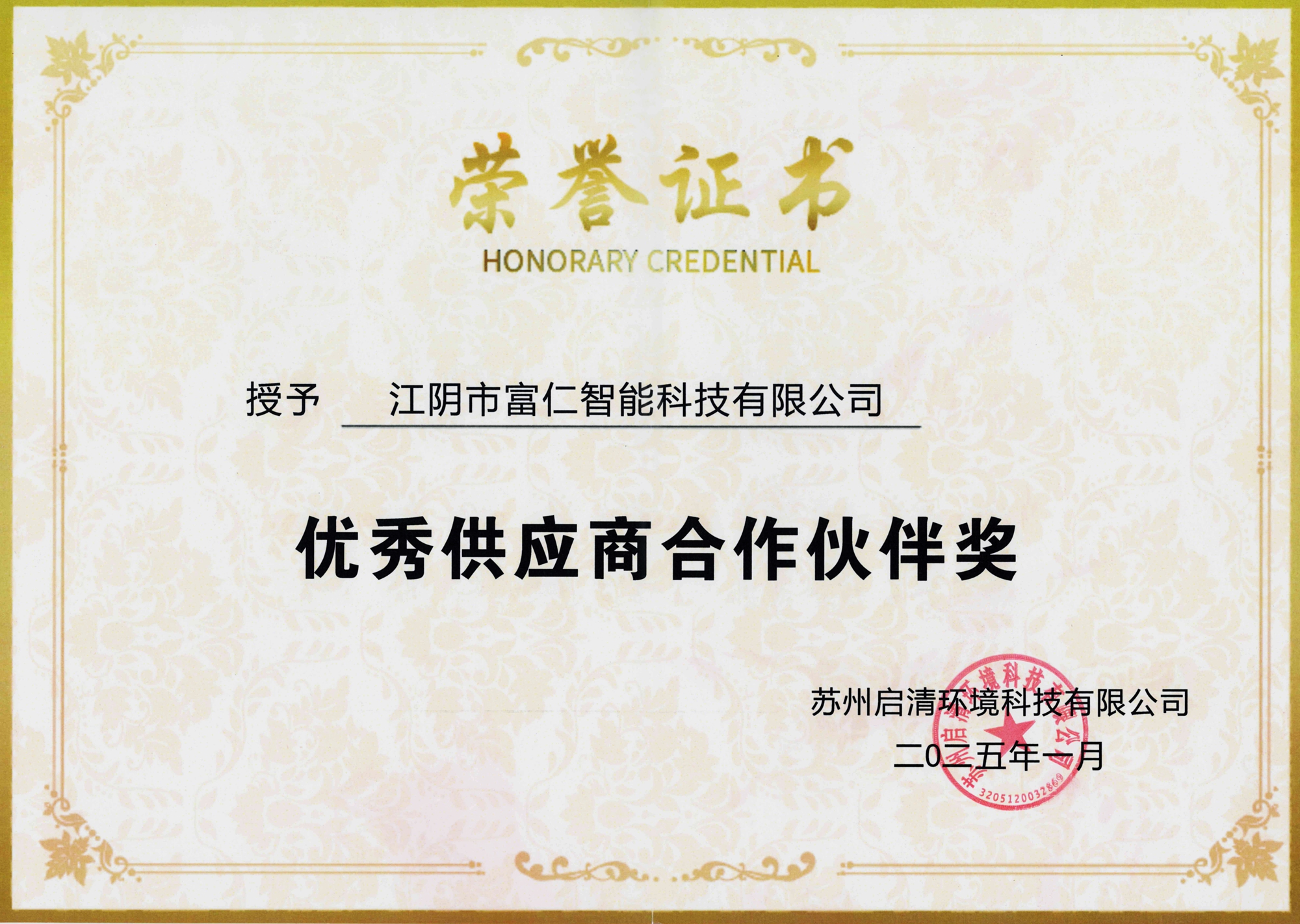“優秀供應商”榮譽不僅體現了啟清環境對與富仁智能合作的肯定,也是對雙方未來合作的期許。富仁智能將始終堅持嚴格的項目質量標準,提供具有競爭力的技術和產品,并在交付能力方面展現高效的響應速度。